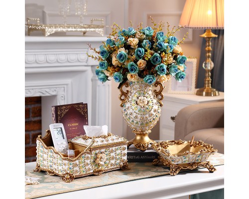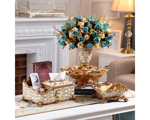 歐式果盤三件套裝奢華客廳茶幾家用裝飾創意花瓶紙巾盒水果盤擺件