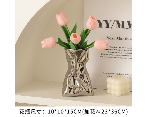 【銀色】褶皺花瓶+5粉郁金香 (NT507)