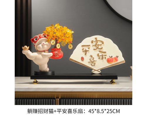 【白色】發財樹招財貓+平安喜樂扇+底座 (NT1,932)