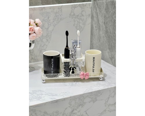 奶白金屬牙刷架+情侶波紋杯 (NT830)