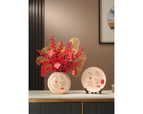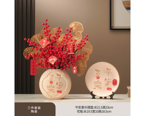 平安喜樂裝飾盤+平安喜樂花瓶 (紅果3+金葉2+掛牌) (NT728)