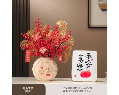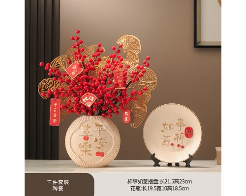 事柿如意裝飾盤+平安喜樂花瓶 (紅果3+金葉2+掛牌) (NT728)