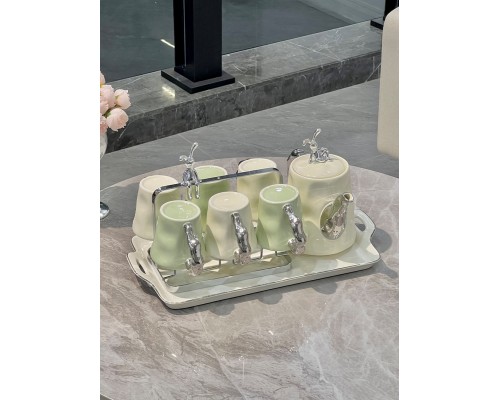 普包【銀把】混色6杯+壺+陶瓷托盤+架子 (NT2,361)